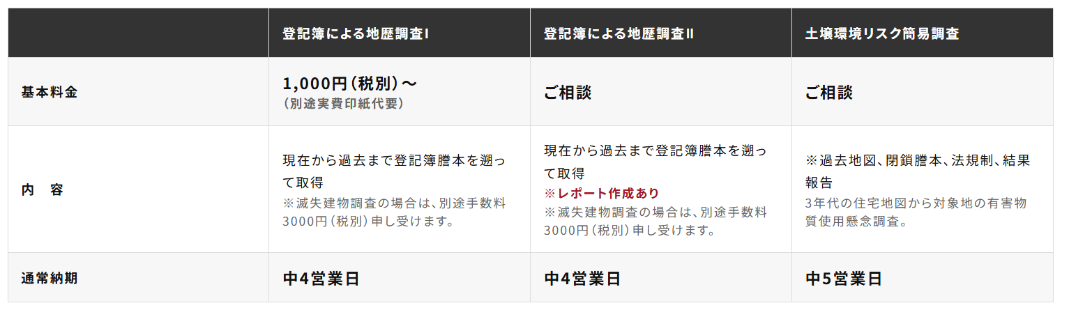 • 土壌汚染調査の内、登記簿による地歴調査のアウトソーシング先が見つかります。
